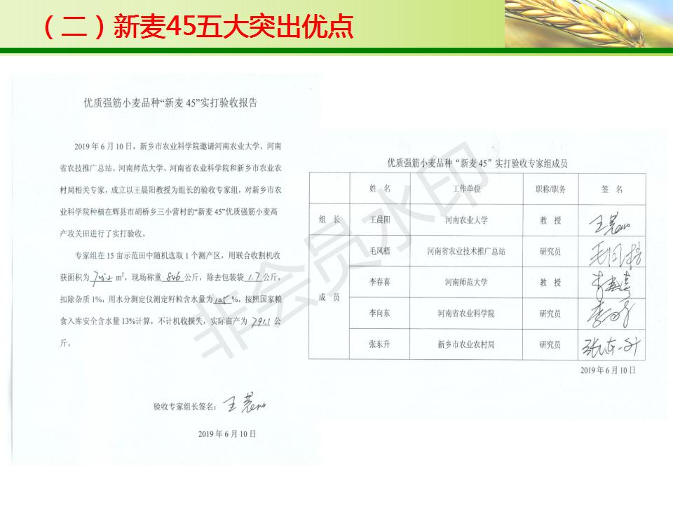 審定意見:該品種符合國家小麥品種審定標準,通過審定。適宜在黃淮冬麥區南片的河南省除信陽市(淮河以南稻茬麥區)和南陽市南部部分地區以外的平原灌區,陜西省西安、渭南、咸陽、銅川和寶雞市灌區,江蘇省淮河、蘇北灌溉總渠以北地區,安徽省沿淮及淮河以北地區高中水肥地塊早中茬種植。
